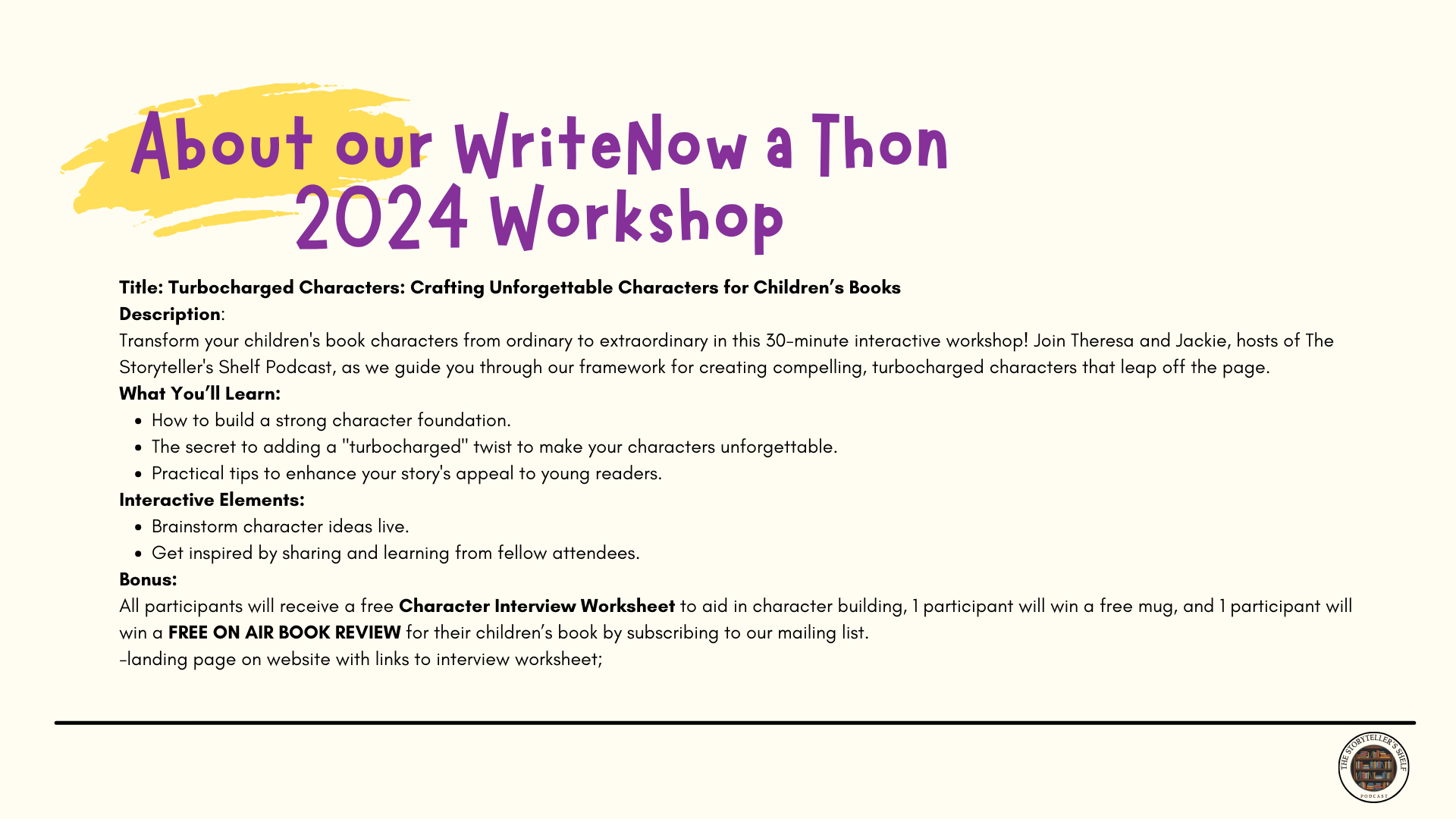 - Meet us live and “in person” in the WriteNow a Thon 2024 on December 28! We will be leading an interactive workshop during this remote event called, Turbocharged Characters: Crafting Unforgettable Characters for Children’s Books. Take a look at the outline and FREEBIES below: