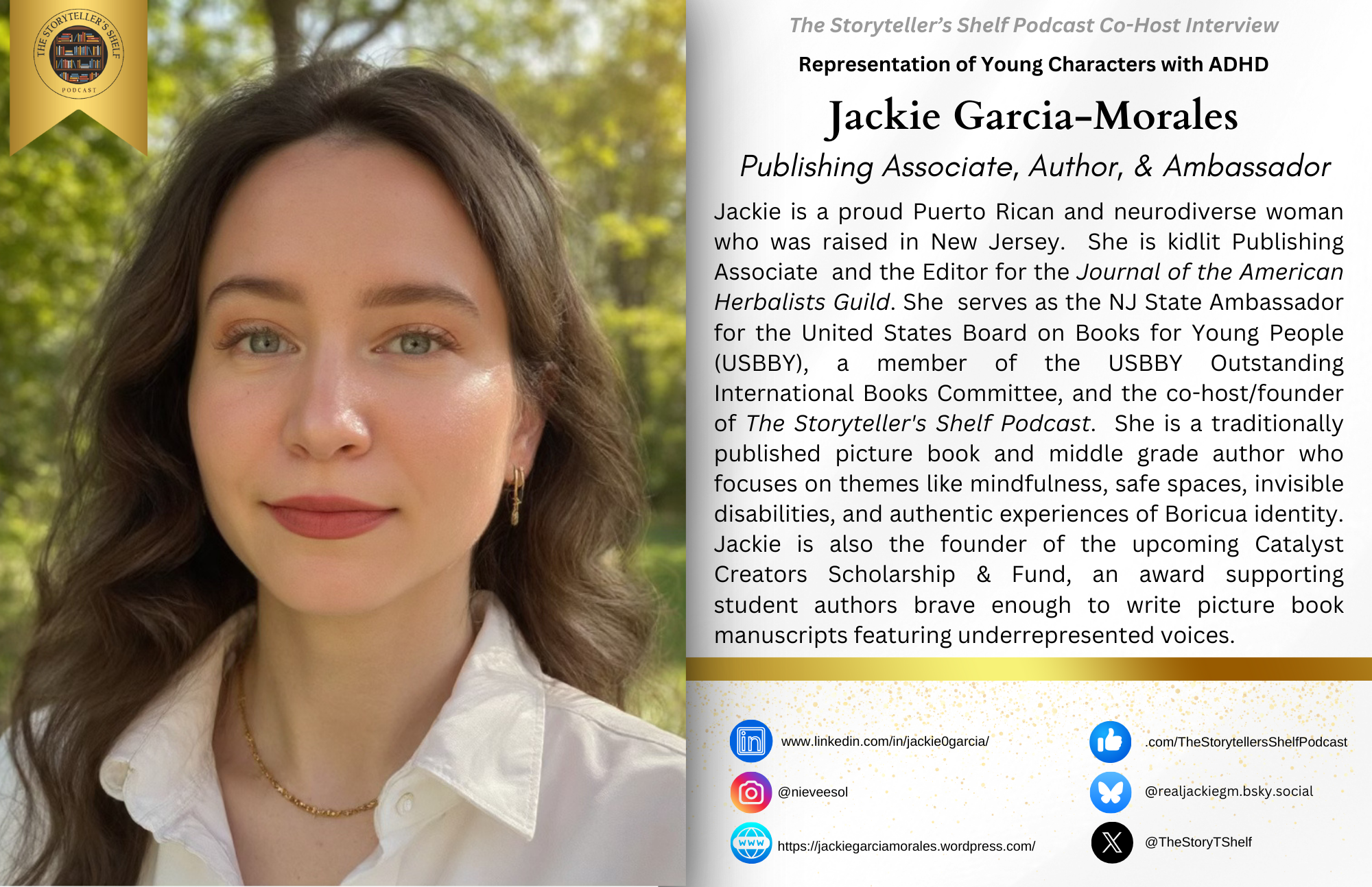 Jackie is a traditionally published picture book and middle-grade author who focuses on themes like mindfulness, safe spaces, invisible disabilities, and authentic experiences of Boricua identity. Her picture books will debut in 2025-2026 with Big Sea and StoryVerse Land (Coeus Learning), and her middle-grade novel in 2026 with Arte Público Press